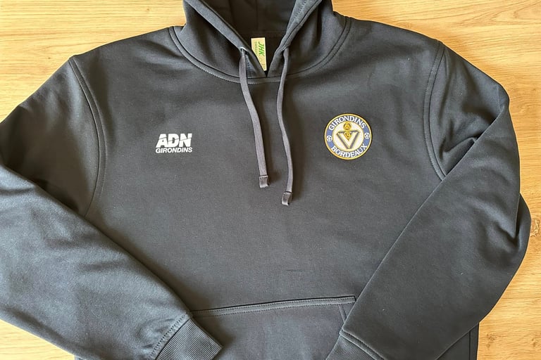 Magnifique sweat à capuche ADN GIRONDINS. Simple et épuré, son visuel ne laissera pas indifférent les supporters bordelais. (65% cotton 35% polyester lavage maxi 40°) Blason brodé et thermocollé.